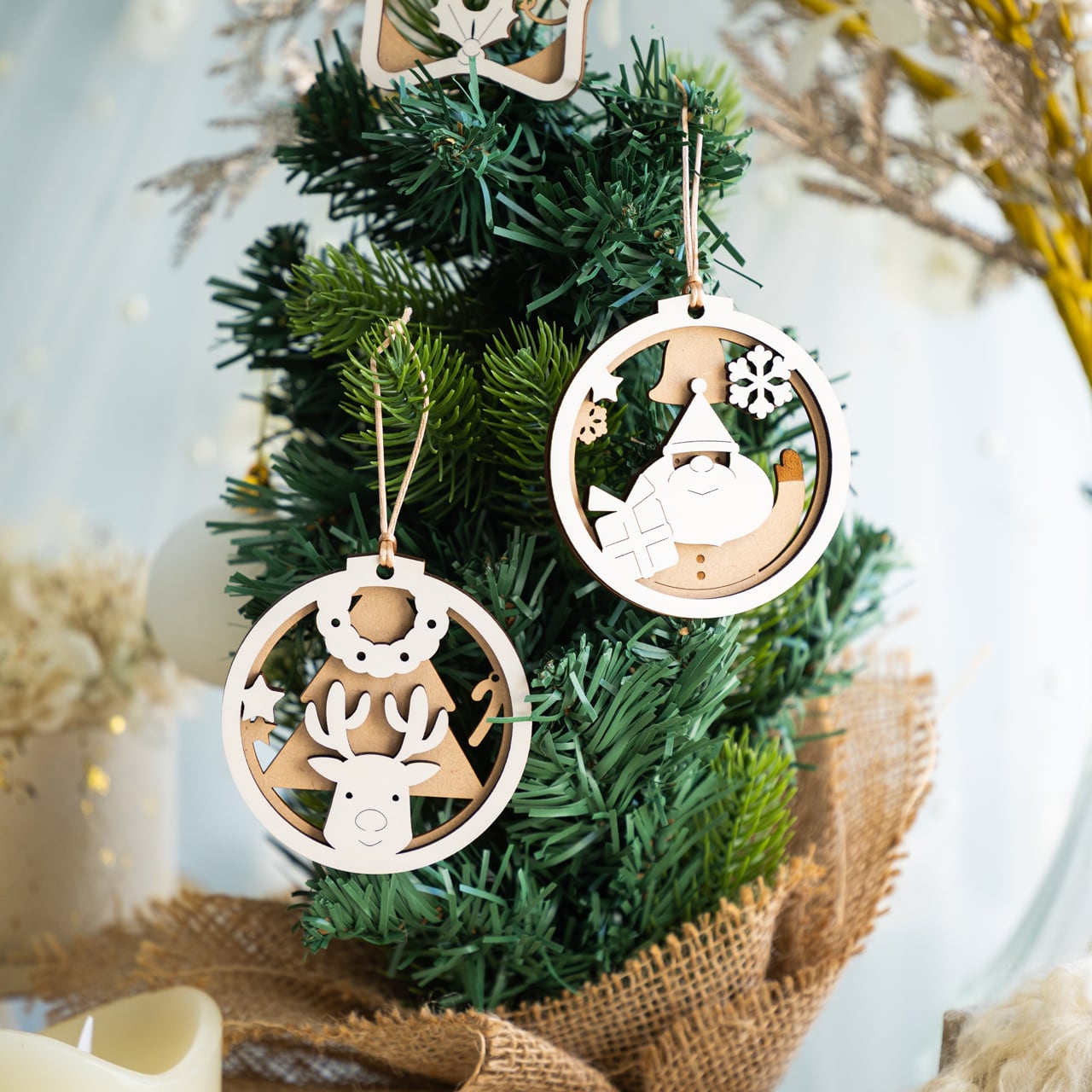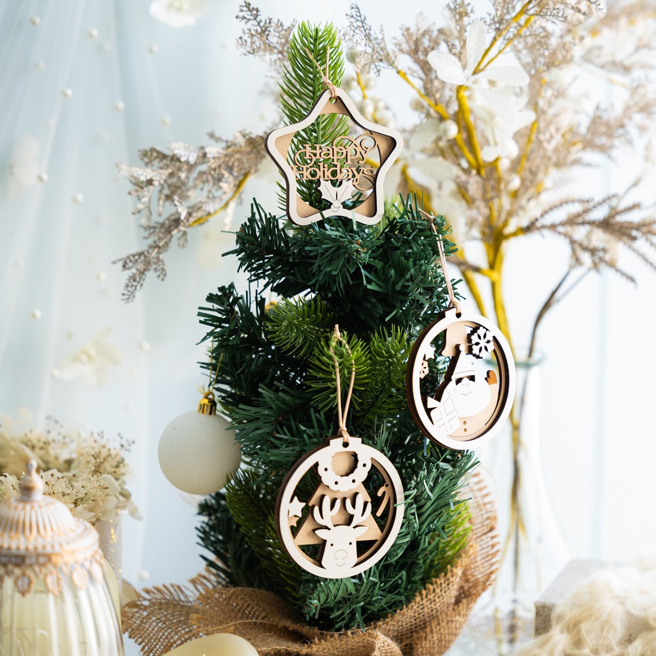 木ならではの自然な風合いと、レーザーカットの繊細さが共存し、ツリーに吊るすと、オーナメント自体が「小さな影絵」のように映えます。