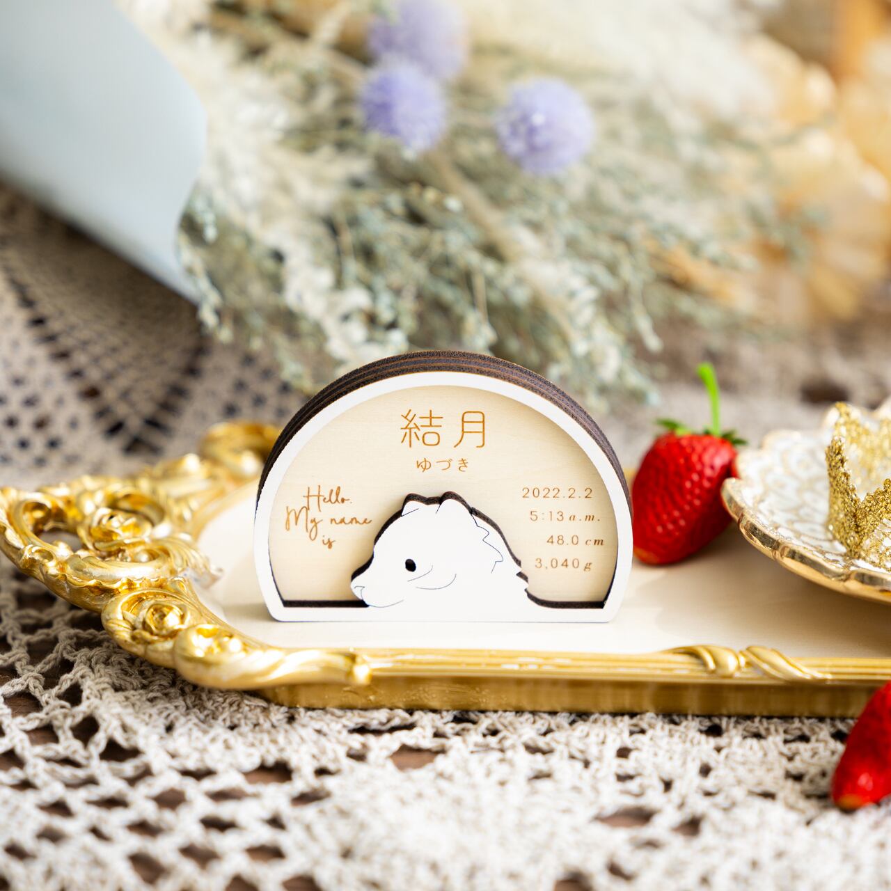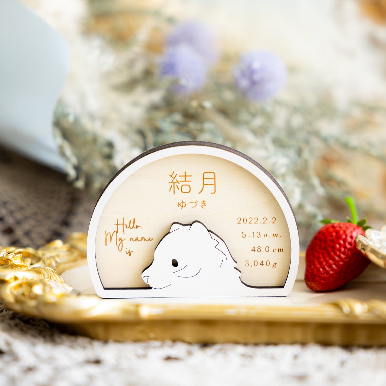 「困難を跳ね返す強さと、勇気を持って歩んでいけますように」という願いを込めたこの命名札が、大切なお子さまを凛と見守るお守りとなりますように。